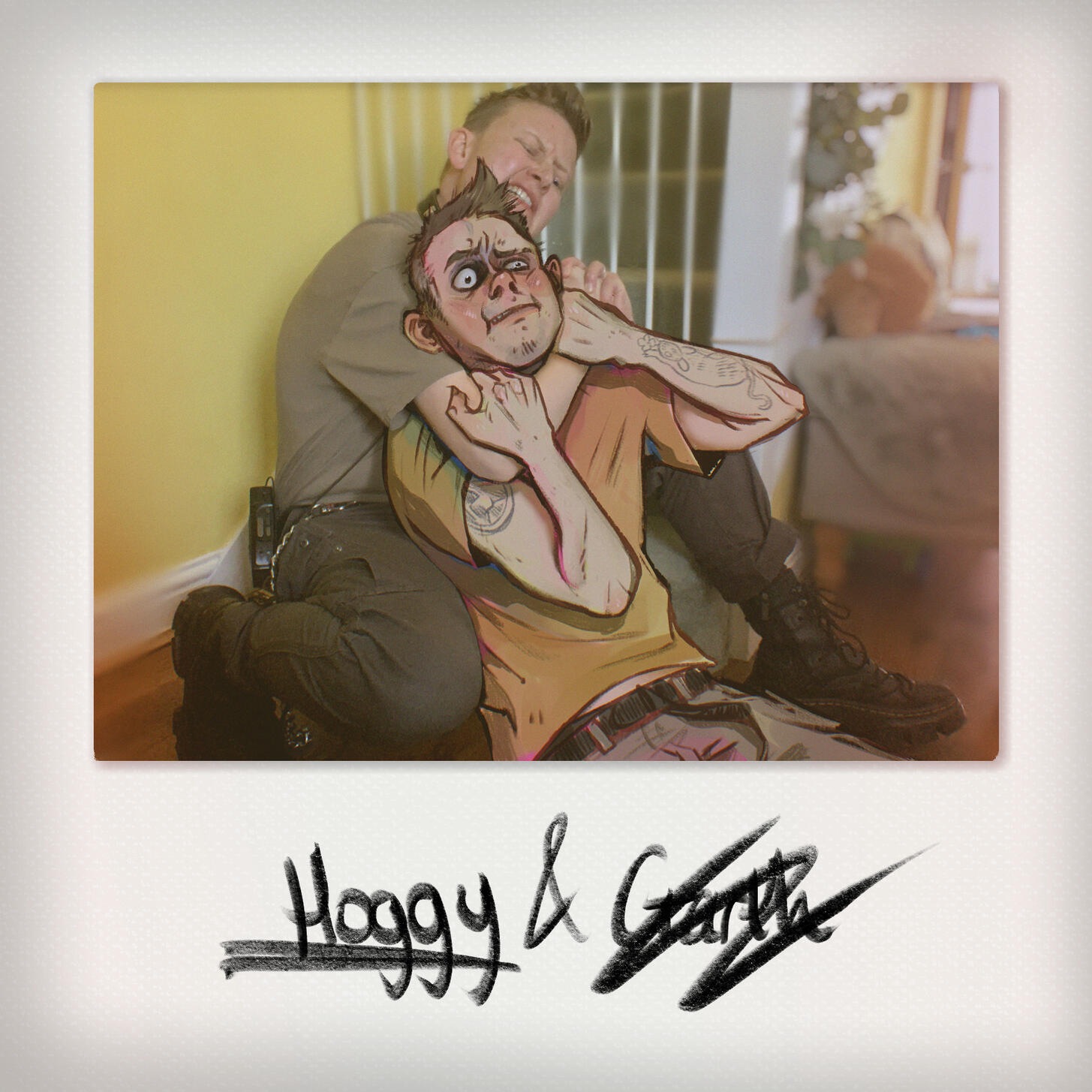 White, transmasc guy with dirty blonde hair and grey-blue eyes.Hoggy = Me / Garth = PersonaHoggy is a real-life artist, wow.